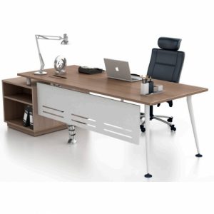 Mẫu bàn làm việc của giám đốc hình chữ L làm cho văn phòng trông sắc nét và quyền lực hơn. Bàn chữ L thường có kích thước lớn. Một phần bàn chính có chiều rộng mặt bàn lớn hơn phần còn lại. Bàn thường tích hợp các tủ nhỏ hoặc kệ để hồ sơ, tài liệu. Việc bố trí như vậy tạo cho chiếc bàn một kiểu dáng riêng biệt giúp người ngồi làm việc thuận tiện hơn.