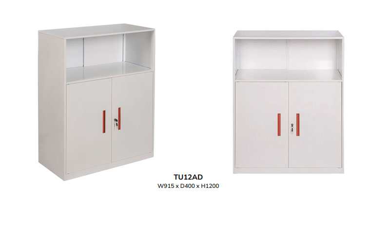 Gia công từ chất thép sơn tĩnh điện, nổi bật với tay nắm âm sơn đỏ cam. Kết cấu tủ phân chia thành 2 khoang, với khoang trên có 2 ngăn kéo nhỏ, khoang dưới có 2 cánh mở và bên trong phân thành 3 tầng để tài liệu.